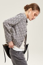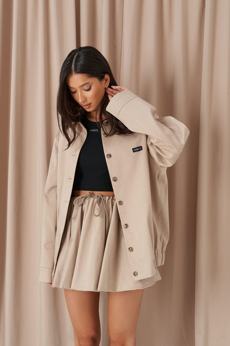Жакет свободного кроя, выполнен из полотна бежевого цвета. Характеристики: воротник отложной, застёжка центральная на петли пуговицы, брендированный подклад (стеганный и утепленный), по переду изделия прорези с карманами, на груди брендированная нашивка, отрезная спинка, вточной широкий рукав, спущен, заканчивается широким манжетом,по низу изделия резинка. Длина по спинке от края горловины 70 см, длина рукава от края горловины 81см.