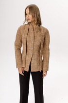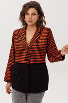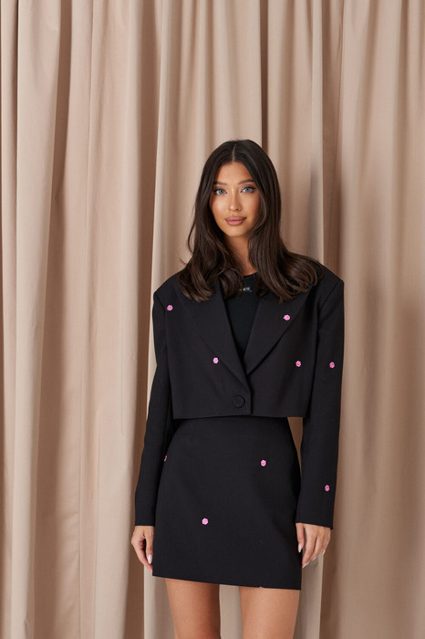 Жакет выполнен из костюмной ткани черного цвета с цветочной вышивкой. Характеристика: укороченный жакет, отложной воротник с острым лацканам, центральная застежка на петлю-пуговицу, брендированный подклад, рукав втачной, чуть спущенный, подплечники, на манжете три пуговицы. Длина рукава от края горловины 79см, длина жакета по спинке 43см.