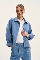 Жакет прямого кроя выполнен из ткани графитового цвета. Характеристики: прямой крой, брендированный подклад (стеганный и утепленный), остроугольный воротник из эко-кожи, застежка центральная на петли пуговицы, по передней части изделия накладные карманы, рукав спущенный, втачной, низ рукава - манжета на пуговице. Длина жакета по спинке 70 см, длина рукава от края горловины 77 см