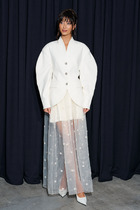 Жакет прилегающего силуэта. Выполнен из костюмный ткани белого цвета. С подкладкой. Воротник-стойка. Вырез горловины V-образный. Рукав втачной, объёмный, заужен к низу. По переду карманы с клапаном. Застёжка центральная - пуговицы. Низ жакета фигурный. Длина спинки 69 см. Длина рукава от линии втачивания 63 см