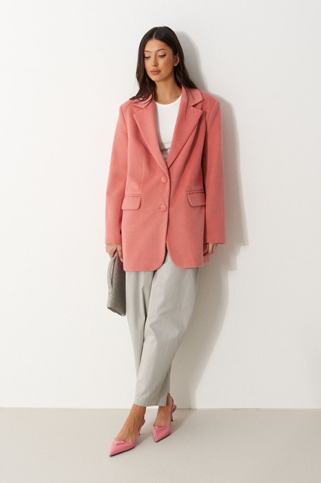 Жакет прямого свободного кроя. Выполнено из пальтовой ворсовой ткани нежного розового цвета. Характеристика: брендтрованная подкладка, воротник отложной с лацканами, рукав втачной и чуть спущен, по переду карманы с клапанами, застёжка центральная - пуговицы, в среднем шве заднего полотна шлица (29,5 см). В комплекте пояс из ткани основного изделия. В комплекте идет пояс из основной ткани изделия. Длина спинки 78 см. Длина рукава от линии втачивания 62 см
