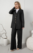 Жакет женский удлиненный, из трикотажной ткани, перед жакета на подкладке, полуприлегающего силуэта с центральной бортовой застежкой на пуговицы до линии перегиба лацкана. Спереди рельефные швы от плечевого шва, отрезной бочок и карман с клапаном. Спинка с рельефами от плечевого шва. Рукав втачной, двухшовный. Воротник пиджачного типа. Длина по спинке 66 см, длина рукава 62 см.