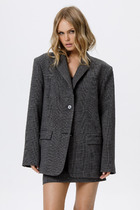 Жакет женский удлиненный, полуприлегающего силуэта с центральной бортовой застежкой на пуговицы до линии перегиба лацкана. Спереди рельефные швы от плечевого шва, отрезной бочок и карман с клапаном. Спинка с рельефами от плечевого шва. Рукав втачной, двухшовный, 3/4, с небольшим разрезом в локтевом шве. Воротник пиджачного типа. Перед жакета на подкладке. Длина рукава 50, длина по спинке 68 см.