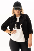 Жакет двубортный, свободного кроя, из текстильной ткани, на подкладке. По переду имеется отрезной бочок и вертикальные вытачки. С прорезными карманами с клапаном и двумя обтачками. Спинка со средним швом. Воротник пиджачного типа. Рукав двухшовный, втачной. Длина рукава 63 см, длина по спинке 74 см.