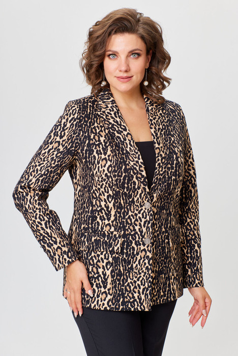 Жакет удлиненный, из текстильной ткани, полуприлегающего силуэта с центральной бортовой застежкой на пуговицы до линии перегиба лацкана. Спереди рельефные швы от плечевого шва, отрезной бочок и карман с клапаном. Спинка с рельефами от плечевого шва. Рукав втачной, двухшовный, по низу рукава шлица на петли-пуговицы. Воротник пиджачного типа. Жакет на подкладке, длина по спинке 67 см, длина рукава 62 см.