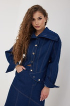Жакет полуприлегающего силуэта с застежкой на петли пуговицы, горловина оформлена воротником жакетного типа, по переду на уровне бедер прорезные карманы в рамку из отделочной ткани.