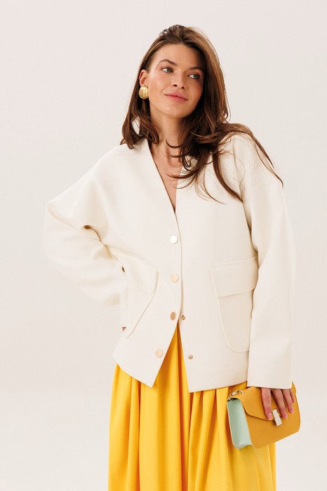 Жакет из поливискозной ткани прямого силуэта на подкладке. Рукав спущенный. На полочках накладный карманы с клапанами. Застегивается на пробивные кнопки.