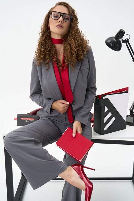 Жакет — укороченного кроя, с акцентированной линией плеч и классическим отложным воротником. Застёгивается на одну пуговицу, что визуально вытягивает силуэт и подчеркивает талию.