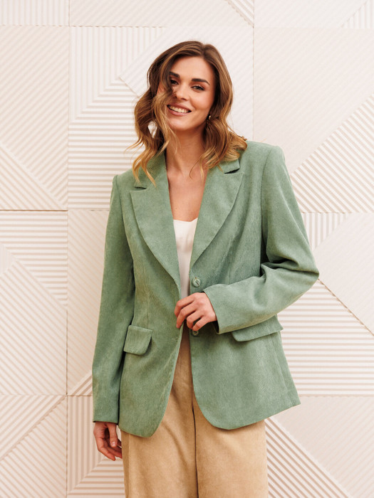 Жакет полуприлегающего силуэта из мягкой вельветовыой ткани. Застежка однобортная на две пуговицы, воротник пиджачного типа. Перед с талиевой вытачкой, рельефом и декоративным клапаном. Спинка с рельефами из проймы и средним швом. Рукав втачной двухшовный. Жакет на подкладке. Длина жакета - 68 см, длина рукава жакета - 60 см.