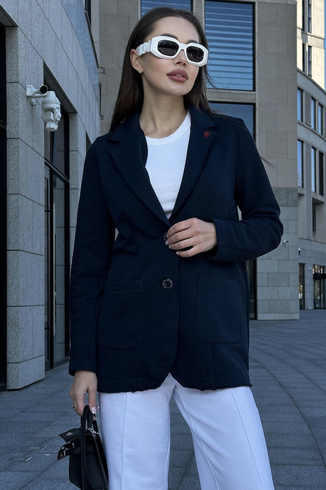 На левом лацкане вышивка-логотип в контрастном цвете. Низ и борта имеют открытые края (эффект необработанного шва), укреплены дополнительной строчкой. Жакет без подкладки.