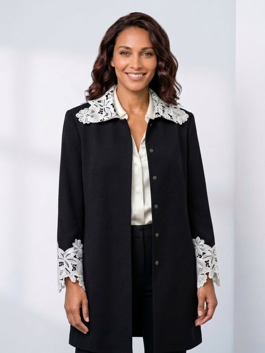 Главная особенность модели — изысканный белый ажурный декор на воротнике и рукавах. Контраст чёрного цвета и нежного кружева придаёт образу утончённость и женственность, добавляя элегантный дизайнерский акцент. Такой удлинённый жакет отлично подходит как для строгих офисных образов, так и для более нарядных комплектов. Длина спинки составляет 79 см — оптимальная длина для создания современного и элегантного силуэта. Длина рукава 54 см (включая кружево), ширина плеча 12–13 см в зависимости от размера, что обеспечивает аккуратную посадку по фигуре.