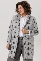 Двубортный жакет полуприлегающего силуэта с застёжкой на две пуговицы с прорезными карманами с листочками и клапанами. Нагрудные вытачки на полочках расположены вертикально и совмещены с талиевыми, заканчиваются входом в карман. Спинка имеет плечевые вытачки, средний шов со шлицей. Рукава двухшовные, длинные. Воротник – стойка переходит в край борта, имеющий V-образную форму. Застежка на прорезные петли и пуговицы. Жакет полностью обработан притачной подкладкой.