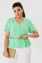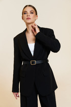Однобортный жакет на подкладке прямого силуэта с застёжкой на две петли и пуговицы. По талии расположена кулиса и шнурок для приталивания жакета. По переду расположены накладные карманы с клапаном и декором. Длина жакета по спинке 68-72 см.
