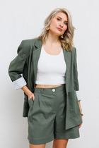 Двубортный жакет полуприлегающего силуэта с застёжкой на две пуговицы с прорезными карманами с листочками и клапанами. Нагрудные вытачки на полочках расположены вертикально и совмещены с талиевыми, заканчиваются входом в карман. Спинка имеет плечевые вытачки, средний шов со шлицей. Рукава двухшовные, длинные. Воротник – стойка переходит в край борта, имеющий V-образную форму. Застежка на прорезные петли и пуговицы. Жакет полностью обработан притачной подкладкой.