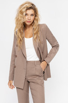 Жакет свободного силуэта с центральнойзастежкой на пришивные кнопки. По переду обраюотаны накладные карманы. Рукав втачной одношовный, из отделочной ткани. Воротник - стойка. Частичная подкладка по переду и спинке.