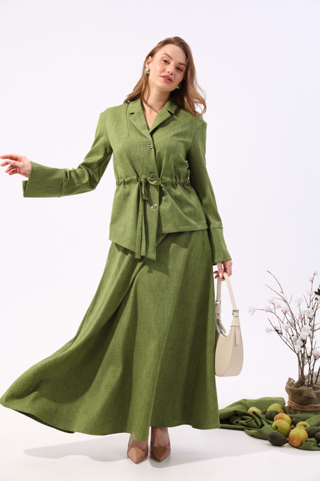 Жакет прямого силуэта, воротник пиджачного типа, рукав одношовный, втачной с незначительно спущенной линией плеча, длинный, с притачной манжетой, декорированной разрезом. По линии ткани настрачная кулиса с завязками из основной ткани. Застежка центрально-бортовая. Линия низа верхней части фигурная ассиметричная.
