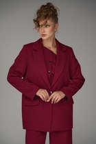 Жакет полуприлегающего силуэта с втачными длинными прямыми рукавами. Перед с двумя нагрудными вытачками, переведенными в подрез, переходящий в боковой горизонтальный карман с клапаном и двумя обтачками и верхним наклонным карманом с листочкой, со смещённой застежкой на петли и пуговицы. Спинка со средним швом, двумя талевыми вытачками и отрезным бочком. Воротник пиджачного типа с заострёнными концами, направленными вверх, с лацканами, переходящими в пояс, застегивающимися сзади на пуговицу. Изделие на подкладке. В комплект к изделию идут съёмные гофрированные манжеты.