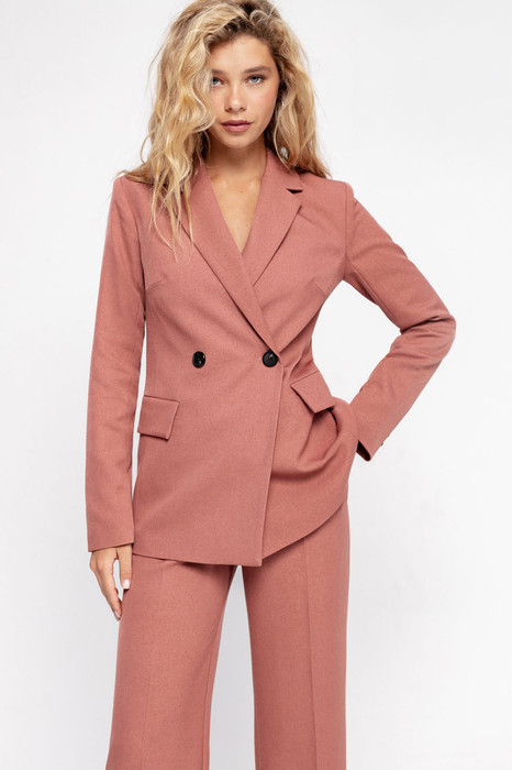 Классический приталенный жакет из текстильной ткани. Детали: жакет с отрезными бочками и нагрудными вытачками, пиджачный воротник, прорезные карманы, двубортная застежка на петли и пуговицы, спинка со средним швом, втачные двухшовные рукава, жакет на подкладке