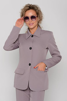 Модель полуприлегающего силуэта, с рельефами, на подкладе. Застёжка двубортная на петли и пуговицы. Спереди прорезные карманы в рамку, а также имитация кармана и декоративные пуговицы. Спинка со средним швом. Воротник пиджачный. По низу рукава обработана шлица с отделочными петлями и пуговицами.