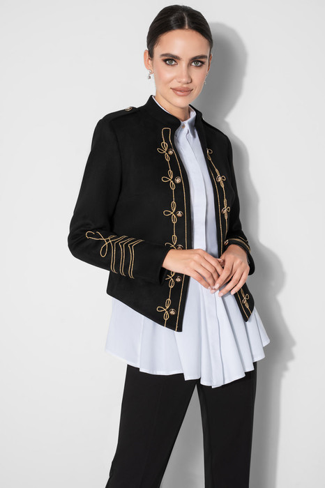 Жакет женский полуприлегающего силуэта из мягкой искусственной замши на трикотажной основе в гусарском стиле с декоративной вышивкой шнуром и шестью пуговицами, расположенными параллельно вышивке вдоль борта на левой и правой половинке, без застежки, на подкладке, с погонами, закрепленными пуговицей. Перед жакета разрезной, с нагрудными вытачками, выходящими из бокового шва. Спинка с рельефами, выходящими из проймы и средним швом. Линия низа асимметричная, спинка короче переда. По низу центральная часть переда выполнена углом. Рукава втачные двухшовные, длинные, с декоративной вышивкой шнуром в нижней части. Горловина обработана воротником-стойкой. Жакет с плечевыми накладками.