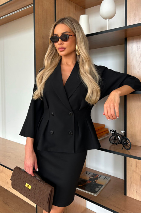 Комфортный жакет приталенного силуэта выполнен из легкой костюмной ткани. Цельнокроенный рукав длиной 7/8. Английский отложной воротник. Двубортная застежка на петли и пуговицы. По линии талии застрочены складки. Низ ровный, без разрезов.