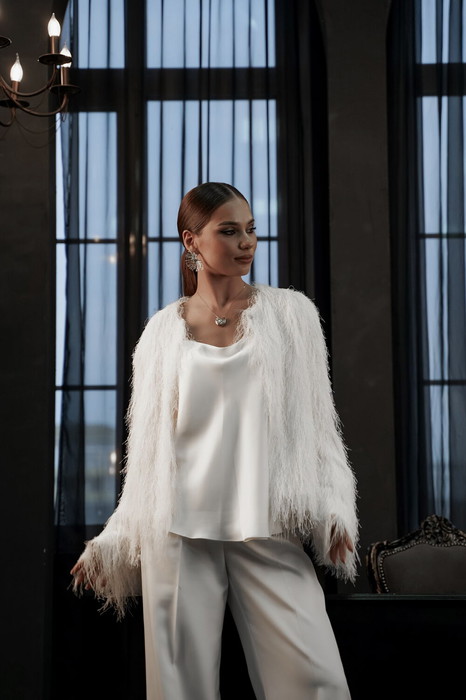 Жакет женский, из костюмно-плательной ткани с эффектом «травка», укороченный, прямого силуэта с центральной застежкой на три кнопки. Рукава длинные, слегка расширенные книзу, жакет на подкладке. Жакет прекрасно дополнит любой вечерний образ.
