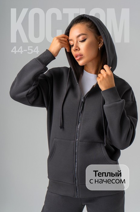 Теплый женский костюм темно-серого цвета выполнен из качественного трикотажа футер с начесом. В комплекте толстовка с объемным регулируемым капюшоном и брюки джоггеры.