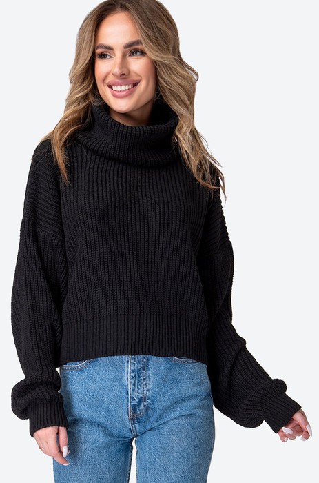 Свободный крой со спущенной линией плеча создаёт просторный силуэт, в котором можно двигаться, как хочется! Черный свитер оверсайз (oversize) – только легкость и максимальное удобство. Ворот хомут защитит от прохладного ветра.