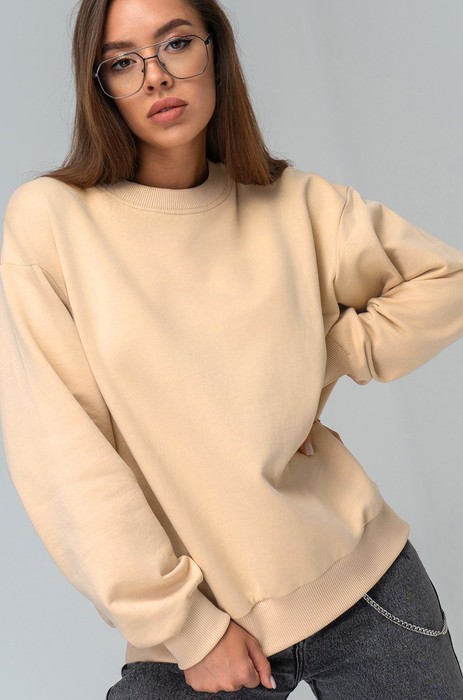 Базовый свитшот песочного оттенка выполнен из 100% хлопка — мягкого и прочного трикотажа. Плотный футер трехнитка сохраняет тепло в холодное время года. Эластичные манжеты защитят от ветра.