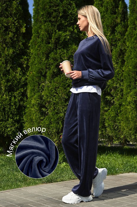 Женский костюм из мягкого велюра цвета индиго — идеальный выбор для тех, кто ценит комфорт и стиль. Однотонный костюм двойка согреет в прохладные дни осени и весны, а лаконичный дизайн подчеркнёт уверенность и вкус.