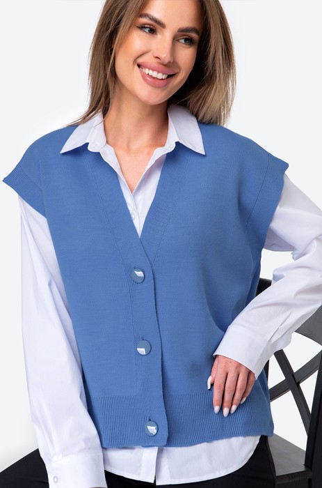 Классический вязаный жилет – базовая модель в женском гардеробе, которая поможет создать трендовый многослойный образ. Женская безрукавка с V-образным вырезом и застежкой на крупные пуговицы выполнена в синем цвете.