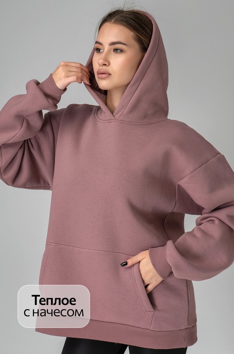 Уютная женская толстовка с капюшоном представлена в пепельно-розовом цвете. Крой оверсайз и спущенное плечо подарят свободу движений, для удобства предусмотрен большой карман-кенгуру.
