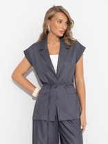 Жилет льняной полуприлегающего силуэта без рукавов. Полочка с центральной застежкой на завязки и крючок, с 2-мя вертикальными вытачками от низа для лучшего прилегания изделия. Спинка с вертикальной вытачкой от низа и центральным швом. Жилет на подкладке из хлопка.