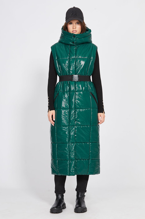 Жилет выполнен из глянцевой плащевой ткани, простеганной с изософтом. Жилет прямого силуэта, длиной миди. Спереди застежка на молнию и кнопки на планке. Карманы прорезные, застегивающиеся на молнию. Спинка со средним швом. Воротник-стойка. Капюшон съемный, крепится на пуговицы. В комплект входит съемный ремень из широкой эластичной тесьмы с пряжкой-карабином. Жилет на притачной по низу подкладке.