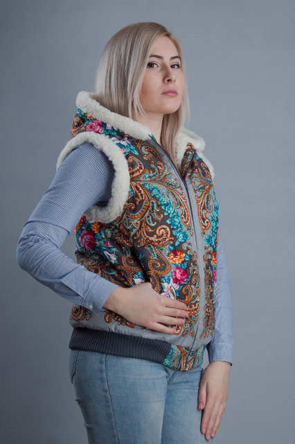 Жилет на молнии с капюшоном, серый с рисунком павлопосадского платка.