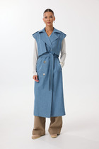 Жилет двубортный с отложным воротником на отрезной стойке, умеренного объема, прямого силуэта с застежкой на петли и пуговицы. Талия фиксируется съемным ремнем из экокожи, для которого в боковых швах оформлены шлевки. Ремень идёт в комплекте к изделию.