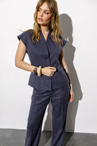 Жилет двубортный с отложным воротником на отрезной стойке, умеренного объема, прямого силуэта с застежкой на петли и пуговицы. Талия фиксируется съемным ремнем из экокожи, для которого в боковых швах оформлены шлевки. Ремень идёт в комплекте к изделию.
