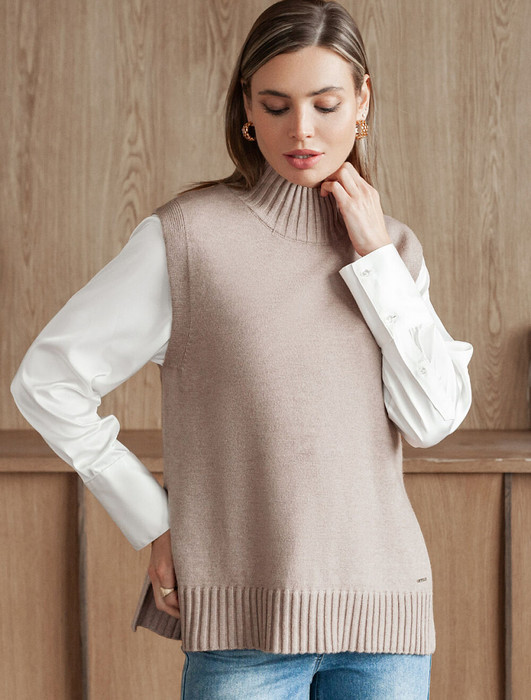 Жилет с воротом стойка выполнен из мягкой пряжи с кашемиром. Модель дополнена боковыми разрезами. Хорошо сочетается лонгсливами и блузками. Мягкая пряжа очень приятная к телу, поддержит комфорт на протяжении всего дня, при этом не перегревая. Сочетается в костюме с брюками D38.013, D38.012 и юбкой D36.016