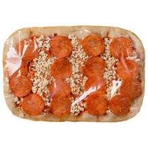 Состав: основа для пиццы отпеченная, томатный соус, сыр с ЗМЖ, масло сливочное, белок молочный, соль поваренная пищевая, изделие колбасное с/к колбаса п/с Пепперони.