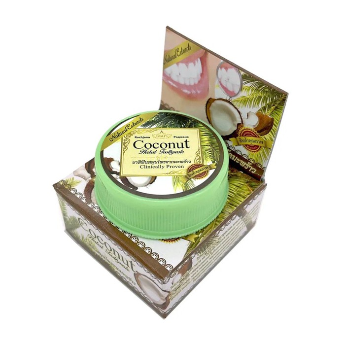 Зубная паста отбеливающая Кокос Rochjana Coconut Herbal Toothpaste не содержит в своем составе химических компонентов - красителей, подсластителей, ароматизаторов поэтому полностью безопасна и полезна.Кроме того, в ее составе эфирные масла, которые обладают антибактериальным действием, убивая микробы в полости рта и горла! Паста предотвращает развитие инфекций, нормализует микрофлору в полости рта и придает дыханию свежесть. Удаляет пятна на зубах от кофе, чая и сигарет.