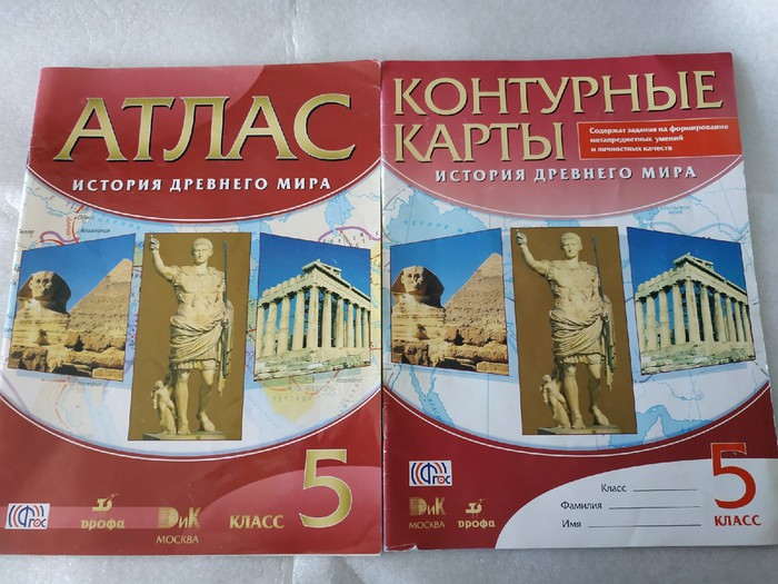 Атлас и контурная карта. Не использовались по назначению. Немного потрёпаны, на контурной карте в углу есть пятнышко посмотреть можно на фото.