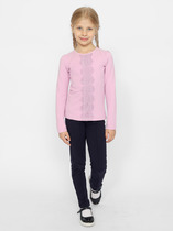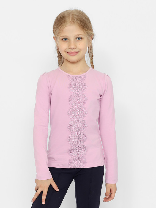 Джемпер для девочки с длинными рукавами. Полочка декорирована кружевом. Рукава со сборкой по окату. Горловина окантована.