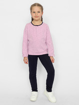 Джемпер для девочки с длинными рукавами из набивной кулирки. Низ рукава и горловина обработаны контрастной бейкой. Сзади застежка на пуговицу.