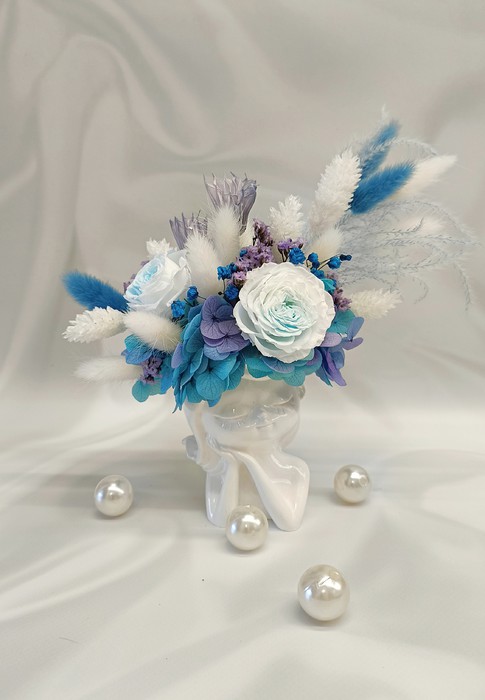 Кашпо, розы пионовидные, фалярис, гортензия градиентная, лагурус, лимониум, гипсофила, нигелла, пампасная пушистая трава