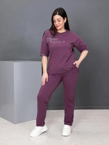 Костюм из футера двунитка (Хлопок 72%; Полиэстер 20%; Лайкра 8%). Брюки длинные с карманами в боковых швах. Джемпер прямого силуэта со спущенной линией плеча. Рукав короткий с отворотиками. Круглый вырез горловины обработан планкой из эластичной ткани. Маркировка 50. В размер.