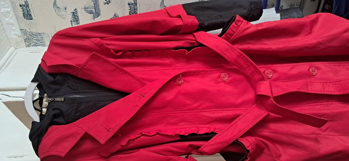 Продаётся женский яркий плащ в хорошем состоянии. Яркий красный цвет с чёрными рукавами. Размер 52, хорошо родойдёт на р. 50-52.