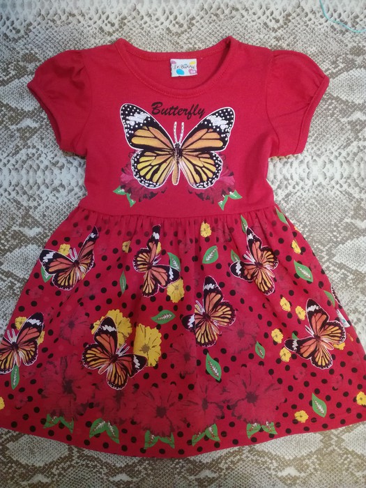 Красивое турецкое качественное платье из плотного хлопка, прекрасно тянется, идёт в размер, 98см, на 3года. Платье было одето пару раз, рисунок бабочка на груди украшен камушками, которые при стирке не отпадают.