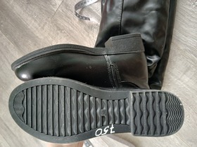 Женские высокие сапоги ботфорты черного цвета, размер 38. Изготовлены из экокожи с искусственным мехом внутри. Высота голенища от пятки составляет 52 см, каблук 3 см. Подошва устойчивая и износостойкая, подходит для разных погодных условий. Состояние отличное, надевались всего один раз в помещении для фотосессии.
