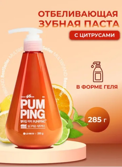 Зубная паста PUMPING гелевая с дозатором, ОТБЕЛИВАЮЩАЯ, гель уход для зубов и за полостью рта Корейская отбеливающая зубная паста Perioe Pumping в форме геля с мягким и свежим цитрусовым вкусом бережно и эффективно очищает поверхность зубов, заботится о состоянии полости рта и повышает эстетический внешний вид. Способствует устранению налета от чая, кофе и сигарет. Перио Пампинг это уникальный новый формат: зубная паста во флаконе с дозатором. Не нужно больше выдавливать пасту, достаточно просто нажать на помпу. Сделайте Вашу ежедневную чистку зубов приятной! Упаковка с помпой поможет экономично расходовать пасту. Гель быстро растворяется и пенится. Пузырьки зубной пасты обволакивают каждый зуб, проникая в самые труднодоступные места, тем самым уменьшают риск появления кариеса. Большой объем: флакон вмещает в себя 3 обычных тюбика зубной пасты.